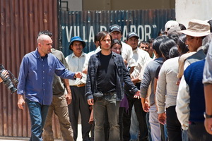 Im Spielfilm Und dann der Regen (También la lluvia) verknüpfen Drehbuchautor Paul Laverty und Regisseurin Icíar Bollaín zwei Handlungsstränge miteinander, die etwa 500 Jahre voneinander getrennt sind: Im Jahre 2000 reist ein spanischer Filmteam unter der Leitung des ehrgeizigen Produzenten Costa (Luis Tosar) und des idealistischen Regisseurs Sebastián (Gael García Bernal) nach Bolivien, um einen Spielfilm über die Ankunft von Christoph Kolumbus in der Neuen Welt zu drehen. Die Dreharbeiten werden von sozialen Unruhen in Cochabamba nachhaltig gestört: Nach der Privatisierung der Wasserversorgung wird der Wasserpreis verdreifacht, was zu einem Generalstreik und zu Zusammenstößen mit der Polizei mit Toten und hunderten Verletzten führt. Im Mittelpunkt des Films im Film steht die historisch verbürgte Predigt, die Bruder Antón Montesinos am 4. Adventssonntag 1511 hielt. Darin wandte sich der Ordensmann gegen die Ausbeutung der Indios: Mit welchem Recht und mit welcher Gerechtigkeit haltet ihr diese Indios in solch grausamer und entsetzlicher Knechtschaft? Sind sie etwa keine Menschen? Bollaíns Und dann der Regen wechselt immer wieder, aber stets in einem dramaturgisch sinnvollen Rhythmus von einer Zeitebene in die andere. Eine besondere Parallele zwischen der Ausbeutung der Einheimnischen im 16. Jahrhundert und in der Gegenwart findet sich im indianischen Hauptdarsteller Daniel (Juan Carlos Aduviri), der im Film im Film als Häuptling Hatuey den Aufstand gegen die spanischen Conquistadores anführt, in der Filmgegenwart als Anführer der einheimischen Bevölkerung im Wasserkrieg auftritt. Aber auch die Filmteam-Mitglieder, insbesondere Kolumbus-Darsteller Antón (Karra Elejalde) und Montesinos-Darsteller Juan (Raúl Arévalo), reflektieren über die erste Stimme des Gewissens gegen ein ganzes Weltreich. Die Kamera von Alex Catalán wechselt ebenfalls zwischen den Nahaufnahmen des Filmteams und den weiten Bildern des Aufstands. Sie wird freilich genauso wenig zum Selbstzweck wie die zurückgenommene Musik von Alberto Iglesias. Über die ausgezeichnete Verknüpfung der verschiedenen Zeitebenen hinaus besticht Und dann der Regen insbesondere durch die nuancierte Figurenzeichnung, die dank hervorragender Schauspieler die Konflikte und die Charakterentwicklung glaubwürdig macht. Interview mit Drehbuchautor Paul Laverty und Hauptdarsteller Juan Carlos Aduviri. In The Wind That Shakes the Barley (2006) hatten Sie zwar den anglo-irischen Krieg im Jahre 1920 thematisiert. Aber ein Drehbuch über eine Geschichte, die 500 Jahre zurückliegt, ist sicherlich etwas ganz anderes. Wie kamen Sie auf die Idee? Paul Laverty: Sie geht auf den Historiker Howard Zinn zurück. Er hatte den Film Brot und Rosen (2000) von Ken Loach gesehen, zu dem ich das Drehbuch verfasst hatte. Daraufhin fragte mich Zinn, ob ich einen auf einem Kapitel seines Buches A Peoples History of the United States basierenden Film drehen würde. Im Buch hatte mich die Reaktion der Priester Antonio de Montesinos und Bartolomé de las Casas, die aus ihrem Gewissen heraus gegen die Ausbeutung der Indios protestierten, ebenso fasziniert wie der Gedanke des Widerstands. Zunächst schrieb ich für den amerikanischen TV-Sender HBO ein Drehbuch für einen Film, der gänzlich im Jahre 1511 spielen sollte. Aus welchen Gründen auch immer wurde das Projekt fallen gelassen allerdings haben sie mir dadurch einen Gefallen getan. Denn ein solches Filmprojekt hätte viele Glaubwürdigkeitsprobleme gehabt: Die ursprüngliche Bevölkerung der Taino ist ausgestorben, genauso wie ihre Sprache Dadurch, dass Und dann der Regen auf zwei so verschiedenen Zeitebenen angesiedelt ist, wird der Film ungemein komplex, zumal weder die Regisseurin Icíar Bollain noch Sie als Drehbuchautor ähnliche Erfahrungen hatten. Paul Laverty: Icíar hat großartige Arbeit geleistet. Wenn die historische Seite monumental ausgefallen wäre, hätte sie leicht den in der heutigen Zeit spielenden Teil erdrücken können. Sie hat beide Handlungsstränge hervorragend miteinander verknüpft. Ein Kunstgriff, den sie dafür anwendet, besteht darin, nicht etwa fertige Szenen des Films im Film, sondern die Proben zu zeigen, denn so spricht sie die Vorstellungskraft des Publikums an. Wie haben die Menschen in Bolivien, die acht Jahre zuvor den Wasserkrieg in der Wirklichkeit mitgemacht haben, darauf reagiert, ihn nun im Film darzustellen? Juan Carlos Aduviri: Der Bolivianer ist eigentlich menschenscheu, misstrauisch vor allem gegenüber Ausländern. Mich hat es deshalb beeindruckt, wie interessiert sie daran waren, dass dieser Film gemacht wird. Weil die Filmproduktion sehr ehrlich mit ihnen umgegangen ist, hatten sie keine Furcht, dass ihr Anliegen missbraucht würde. Wie kann man vor diesem Hintergrund die Beziehung zwischen Ihrer Figur Daniel mit Luis Tosars Figur Costa bezeichnen? Ist es nicht etwas klischeehaft, dass aus den größten Gegensätzen dann Freunde werden? Juan Carlos Aduviri: Ich konnte mich mit Daniel identifizieren, denn mir ist etwas Ähnliches passiert: Als Filmstudent hatte ich großen Streit mit dem Verwaltungschef der Filmhochschule, weil er uns nicht die Geräte zur Verfügung stellte, die wir brauchten. Mit der Zeit habe ich verstanden, dass er es einfach nicht konnte. Nachdem wir uns zwei Jahre lang bekämpft hatten, sind wir Freude geworden. Ich denke, meine Figur ist sehr menschlich, er ist kein strahlender Held, sondern macht auch Fehler. Paul Laverty: Wichtig scheint mir in diesem Zusammenhang auch, dass Costa nicht vorgibt, das sei eine Freundschaft fürs Leben. Aber: Trotz seines Zynismus hat er Daniel als menschliches Wesen kennengelernt. Beim Schreiben kam es mir darauf an, dass sich diese Charaktere entwickeln. Beim ersten Projekt, einen ausschließlich im 16. Jahrhundert angesiedelten Film zu realisieren, stand Montesinos im Mittelpunkt. Hier rückt er etwas in den Hintergrund Paul Laverty: Der ursprüngliche, der historische Film, sollte nac